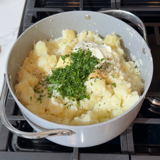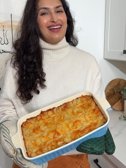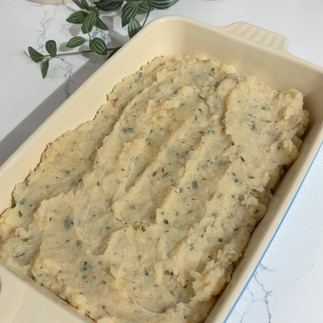 The mashed layer is rich with herbs, basil, dill, and paprika and finished with Greek yogurt, Parmesan, and cheddar for depth and tang. Topping it with thinly sliced potatoes ensures the dish gets that perfect combination of creamy, fluffy inside with a crunchy, cheesy top.
