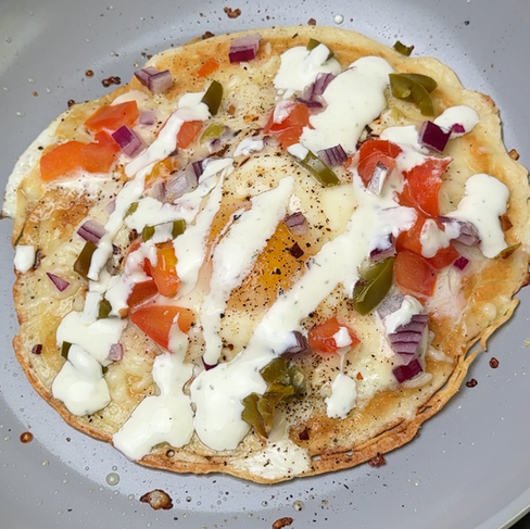 For the filling, I went savory: eggs, cheese, diced tomato, red onion, pickled jalapeño, and a pinch of red crushed pepper, salt, and black pepper. Everything cooks together in the crepe until the egg is perfectly set and the cheese melts. Then comes the fun part: a creamy yogurt sauce made with cilantro, garlic seasoning, and a pinch of sea salt, drizzled over the crepe with fresh arugula on top. The flavors are bright, fresh, and just a little decadent.