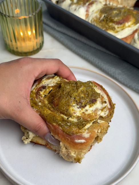 The result? A melt-in-your-mouth, protein-boosted bun that’s golden on the outside, fluffy in the center, and glazed with a creamy pistachio–Greek yogurt topping.