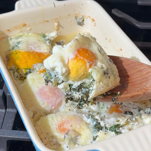 The magic is in making six little wells in your spinach-yogurt mixture and cracking an egg into each one. As it bakes, the yogurt mixture puffs slightly around the eggs, leaving the yolks soft-set while the whites turn silky. It’s indulgent but light, savory but fresh, and ridiculously easy for meal-prep mornings.